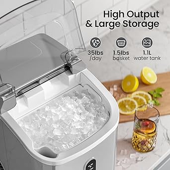 - Rapid Continuous Ice Production:AGLUCKY nugget ice maker to produce up to 35 lbs of pebble ice per day. Equipped with R600A refrigerant, ice production in 7 minutes and comes with an ice basket that holds 1.5 pounds, you’ll never run out of ice.You can enjoy ice cubes anytime, anywhere