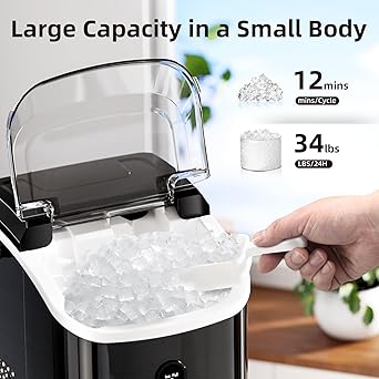 - FAST ICE MAKING:Fill 1.1l of water into the water tank, maximum ice capacity can reach 34lbs in 24 hours. It won’t make you feel anxious because of waiting, let you and your family have ice cubes all day long