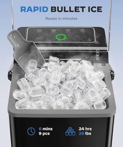 - Ice Anytime & Anywhere: This ice maker delivers 9 fresh bullet-shaped ice cubes in just 6-8 minutes to chill drinks fast. With a 26 lbs daily capacity, it’s perfect for home, office, Kitchen, and even social gatherings.