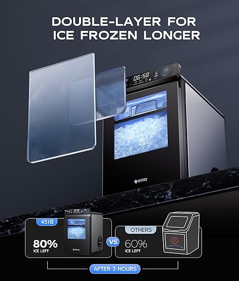 The Ecozy Smart Nugget Ice Maker IM-NS451B is the best ice maker I have owned! We have had a big need for quite awhile for a solid counter top ice maker and Ecozy has delivered surpassing my expectations! I don’t leave many reviews unless i truly believe in the product and this machine carries through on its promise to quickly make nugget ice and it’s so easy! The app is incredible and self explanatory, the timing functions, self cleaning, light and other extras make it seem like an appliance def for 2025! The compact style fits well not taking much space at all! The clean lines of the machine physically with its well lit and graphic dashboard adds its appeal in a way that leave other makers as just blah. The ultimate test is will is quickly make ice and a lot of it…yes! The quality of ice is superb and it runs so quietly. If you’re looking for an ice maker – this is a no-brainer!