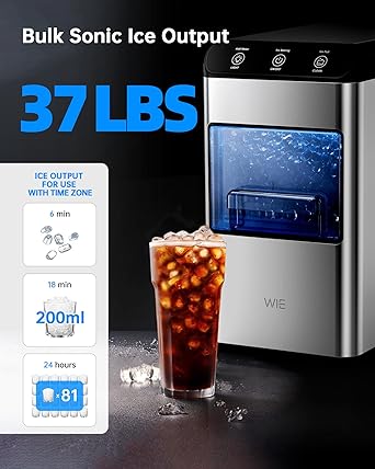 - PERFECT FOR BATCH ICE MAKING: It is easily setting under any cabinet with dimension of 12.99*12.79*7.28inches, our pebble ice maker delivers in just 6 minutes under efficiency compressor, with a capacity to product 37 pounds of nugget ice basically 24/7. Allow you to enjoy chilled beverages, fresh foods and iced compresses at home all day.