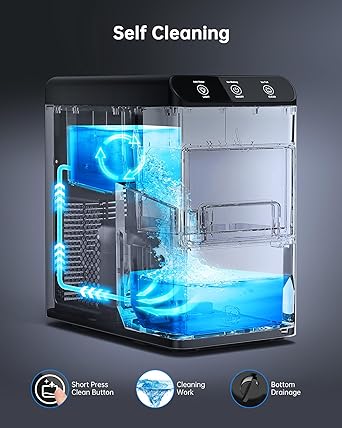 - EASY TO SETUP AND TO USE: Filling the water under the maxline into the small ice reservoir 1.2L , with a quick press “ON/OFF” then start to make ice immediately. With a quick press ” cleaing” to refresh the nugget ice maker for 5 minutes, after the light turn off just need removable the drain plugs to pour out the water. Just three steps to get your new shiny crushed ice.