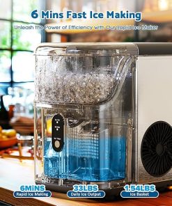 - MORE EFFICIENT ICE MAKING: Our efficient and portable table top ice maker ensures a constant supply of ice, with fast 6-minute ice making that produces up to 33 pounds of ice per day and a storage capacity of 0.7KG (1.54 pounds), enough for family/friends gatherings and outdoor events. The large capacity and efficient nugget ice maker won’t make you anxious about waiting.