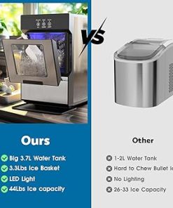 - MORE EFFICIENT ICE MAKING: Our efficient and portable table top ice maker ensures a constant supply of ice, with fast 6-minute ice making that produces up to 44 pounds of ice per day and a storage capacity of 1.5KG (3.3 pounds), enough for family/friends gatherings and outdoor events. The large capacity and efficient nugget ice maker won’t make you anxious about waiting.