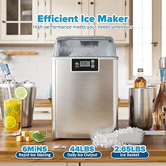- 【MORE EFFICIENT and FAST ICE MAKING】Our efficient and portable countertop ice maker ensures a constant supply of ice, with fast 6-minute ice making that produces up to 44 pounds of ice per day and a storage capacity of 2.65 pounds, enough for family gatherings and outdoor events. The large capacity and efficient ice maker won’t make you anxious about waiting, so you and your family can have ice all day long. Say goodbye to buying ice forever!