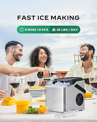 - ➤Fast Ice Making: In just 6 minutes, this ice maker can make 9 perfectly formed bullet ice cubes. The 1.2L water tank can be filled as needed to make a maximum of 26 lbs of ice in 24 hours. Enjoy fresh ice whenever you need it without having to buy bagged ice.