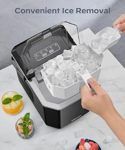 - Portable and Convenient: Equipped with a sturdy handle for easy transport, this ice maker machine weighs only 13.7 lbs and includes a scoop that attaches to the basket for convenient storage. It’s perfect for moving between rooms or bringing to events