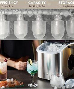 - Impressive Ice-making Capacity – Efficiency shines with our ice maker, producing 26 lbs of bullet-shaped ice cubes within 24 hours. It takes just 6-9 minutes (varies based on ambient and water temperature) to craft 9 chewable ice cubes. Fulfill your daily ice needs effortlessly. The 0.35-gallon water tank accommodates ample water for ice-making, and the ice basket can store up to 1.3 lbs of ice.