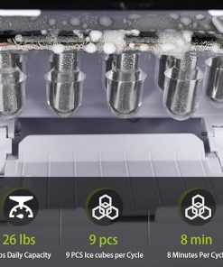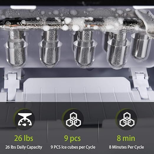 - <b> Speed Ice Making</b>:Ice Machine countertop creates <br/> crystal, bullet shaped ice cubes. 26lbs. ice in 24 hours,9 cubes per cycle within 8 mins.<br/> Bullet shaped ice cubes are perfect fit into any drinks and more. This portable<br/> ice maker works in a speedy way with its 1.5-liter water reservoir.